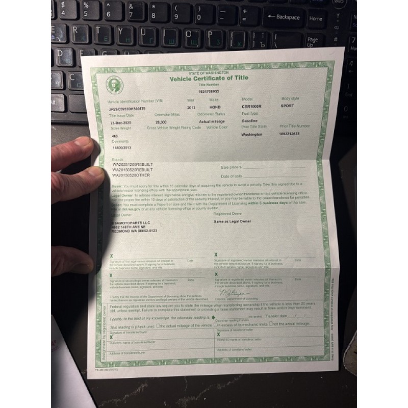 Removed from: 2013 Honda CBR1000RR  - REBUILT  TITLE